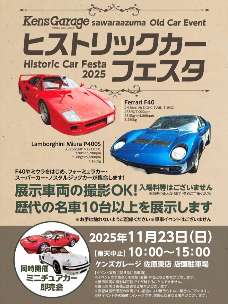 2025.11.05 <イベント予告>ケンズガレージ佐原東店 ヒストリックカーフェスタ2025 今年もケンズガレージ佐原東店にて、ヒストリックカーフェスタに参加します! 開催日時:11月23日(日)10:00~15:00 スーパーカーなど実車も店頭に並びますので、ぜひご来店下さい😄 一覧にもどる